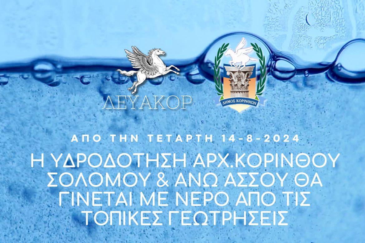 Σας ενημερώνουμε ότι λόγω της παρατεταμένης ζέστης, της αυξημένης κατανάλωσης νερού και της μείωσης της παροχής των πηγών της Στυμφαλίας, από την Τετάρτη 14-8-2024, η υδροδότηση των οικισμών Αρχαίας Κορίνθου, Σολομού και Άνω Άσσου, θα γίνεται με νερό από τις τοπικές γεωτρήσεις.