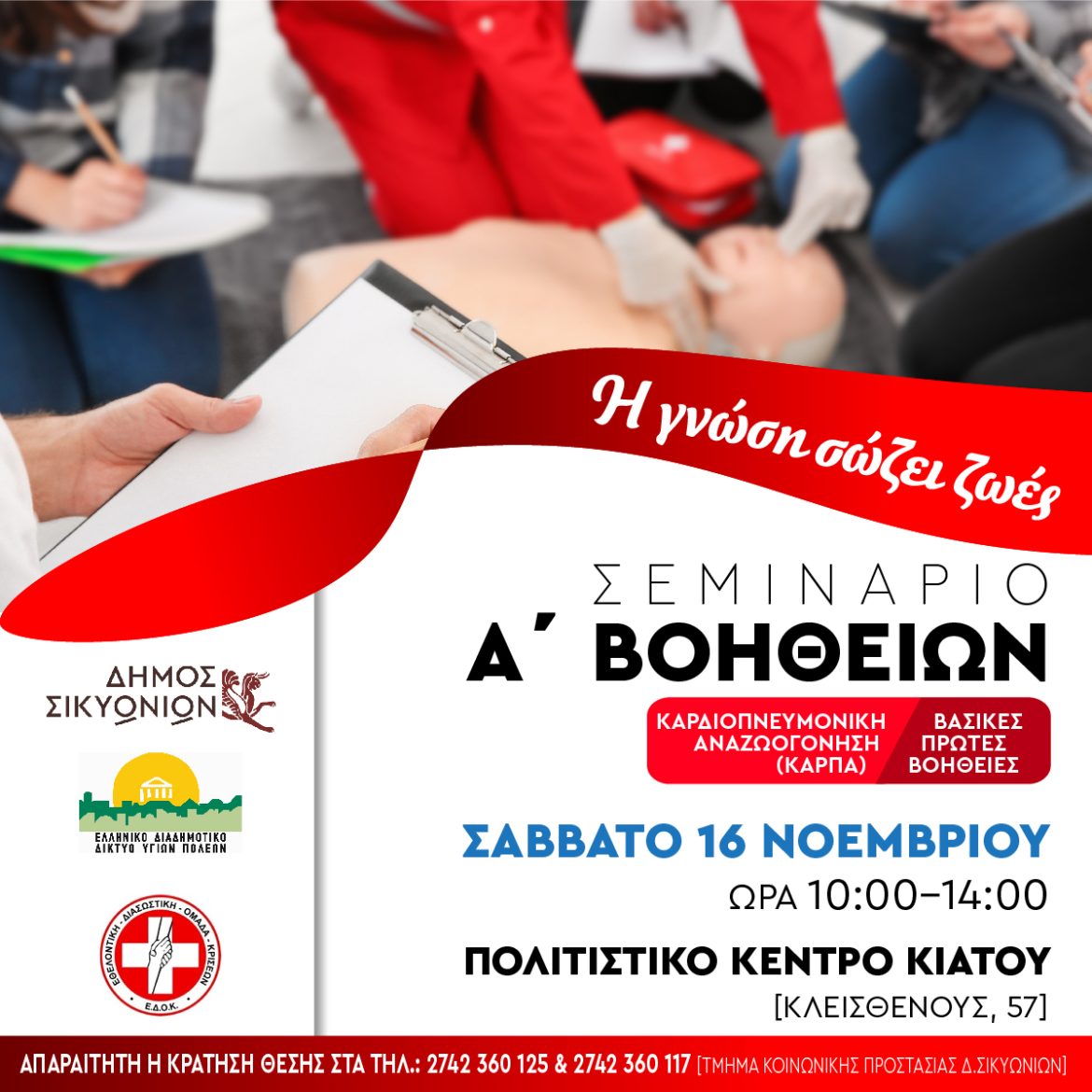 Ο Δήμος Σικυωνίων σε συνεργασία με το Ελληνικό Διαδημοτικό Δίκτυο Υγιών Πόλεων και τους διασώστες της Εθελοντικής Διασωστικής Ομάδας Κρίσεων ΕΔΟΚ, διοργανώνει το Σάββατο 16 Νοεμβρίου 2024 και ώρα 10:00-14:00, στο Πολιτιστικό Κέντρο Κιάτου (Κλεισθένους 57), το εξαιρετικά χρήσιμο σεμινάριο Α’ Βοηθειών «Η γνώση σώζει ζωές».