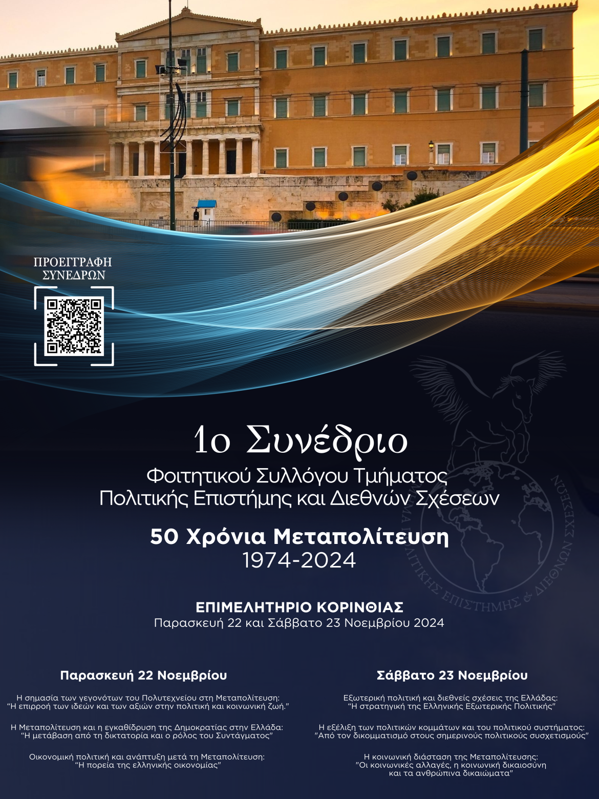 1ο Συνέδριο του Φοιτητικού Συλλόγου Τμήματος Πολιτικής Επιστήμης και Διεθνών, με θέμα τα 50 Χρόνια Μεταπολίτευση, που θα πραγματοποιηθεί την Παρασκευή 22 και το Σάββατο 23 Νοεμβρίου 2024 στο Επιμελητήριο Κορινθίας. Επιφανείς ακαδημαϊκοί και πρόσωπα της πολιτικής σκηνής της χώρας θα πλαισιώσουν το συνέδριο, υπό τον συντονισμό δημοσιογράφων.