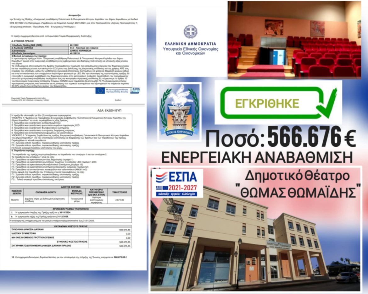 Την έγκριση πέντε δράσεων που θα οδηγήσουν στην ενεργειακή αναβάθμιση του Δημοτικού Θεάτρου πέτυχε ο Δήμος Κορινθίων, μέσα από χρηματοδότηση στο πρόγραμμα «Περιβάλλον και Κλιματική Αλλαγή». Πρόκειται για δράσεις (προϋπολογισμού 566.676 ευρώ) που δημιουργούν ένα ολοκληρωμένο σύμπλεγμα υψηλής ενεργειακής απόδοσης, με σημαντικό περιβαλλοντικό αποτύπωμα.