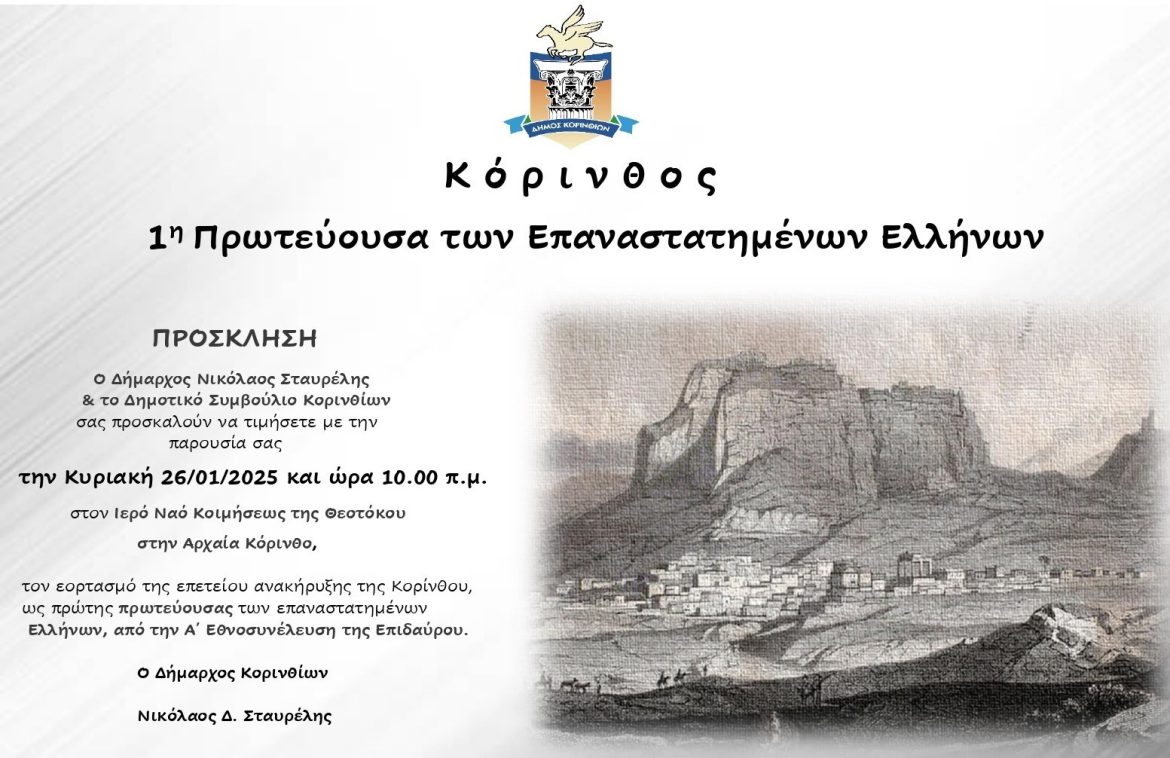 Την Επέτειο της Ανακήρυξης της Κορίνθου ως Πρώτης Πρωτεύουσας της Νεότερης Ελλάδας, κατά την διάρκεια των εργασιών της Α΄ Εθνοσυνέλευσης (Επίδαυρος, Ιανουάριος 1822), θα γιορτάσει η Κόρινθος την Κυριακή, 26 Ιανουαρίου 2025, στις 10.00 το πρωί.
