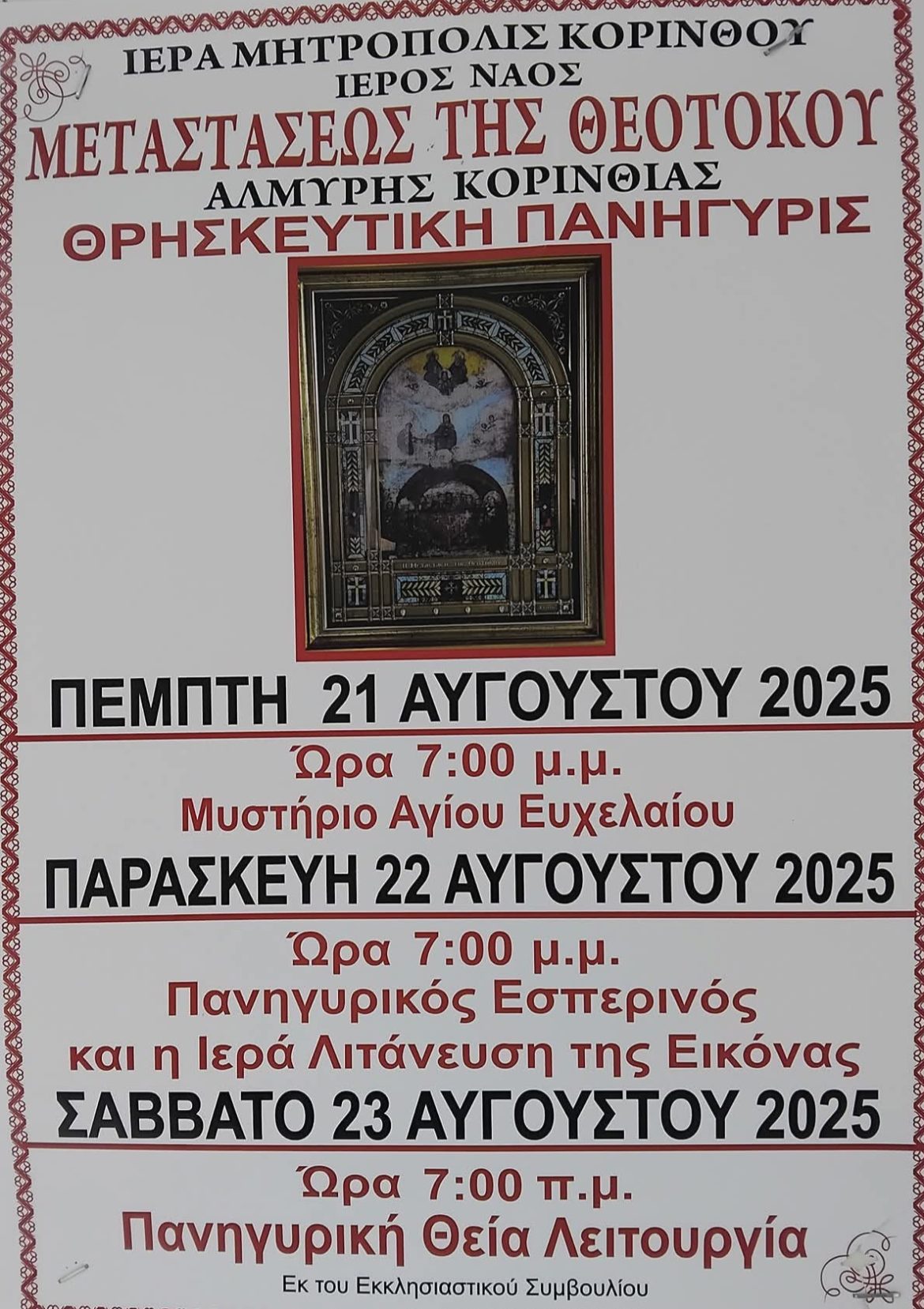 ΚΟΡΙΝΘΙΑΚΑ ΝΕΑ Δείτε το πρόγραμμα του Ιερού Ναού της Μεταστασεως της Θεοτόκου στην Αλμυρή Κορινθίας by Κ. Α. 18 Αυγούστου, 2025 written by Κ. Α. 18 Αυγούστου, 2025 596 0 FacebookTwitterPinterestEmail Κ. Α. previous post Εθελοντική αιμοδοσία στην Ξυλοκέριζα Κορινθίας next post Ασθενής σεισμική δόνηση μεγέθους 2,1 Ρίχτερ στον Κορινθιακό κόλπο