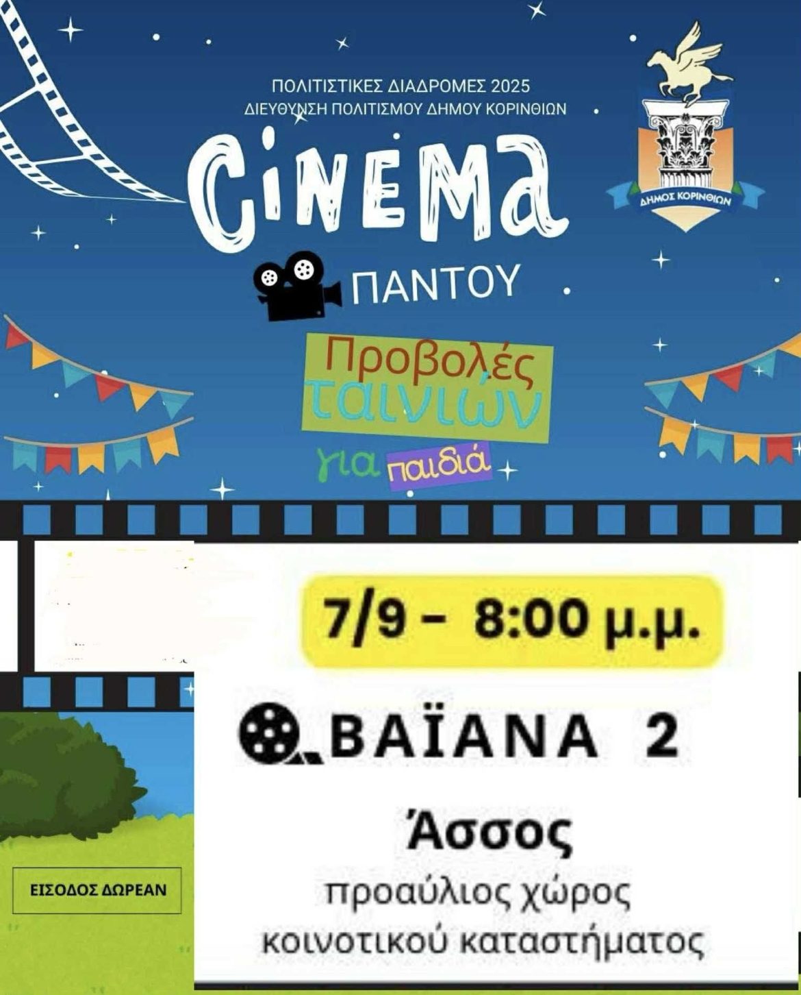 Κυριακή 7/09/2025.Πλατεία Κοινότητας Άσσου. Περιμένουμε όλους τους μικρούς μας φίλους να απολαύσουν την παιδική ταινία ΒΑΙΝΑ 2. Ώρα έναρξης 8.00 μμ.