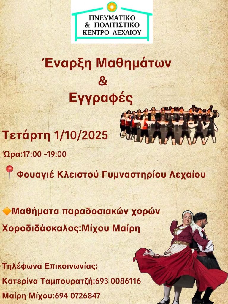 ΚΟΡΙΝΘΙΑΚΑ ΝΕΑ Πνευματικο Πολιτιστικο κέντρο Λεχαιου.Μαθηματα Παραδοσιακών Χορών by Κ. Α. 15 Σεπτεμβρίου, 2025 written by Κ. Α. 15 Σεπτεμβρίου, 2025 369 0 FacebookTwitterPinterestEmail Κ. Α. previous post Νεα σύλληψη για ναρκωτικά. Κατασχέθηκαν πάνω από -12,5- κιλά κάνναβης next post Ο ΕΠΙΣΚΟΠΟΣ ΚΕΓΧΡΕΩΝ ΣΤΟ ΠΑΝΗΓΥΡΙΖΟΝ. ΙΕΡΟ ΗΣΥΧΑΣΤΗΡΙΟ «Ο ΤΙΜΙΟΣ ΣΤΑΥΡΟΣ» ΜΑΨΟΥ ΚΟΡΙΝΘΙΑΣ.