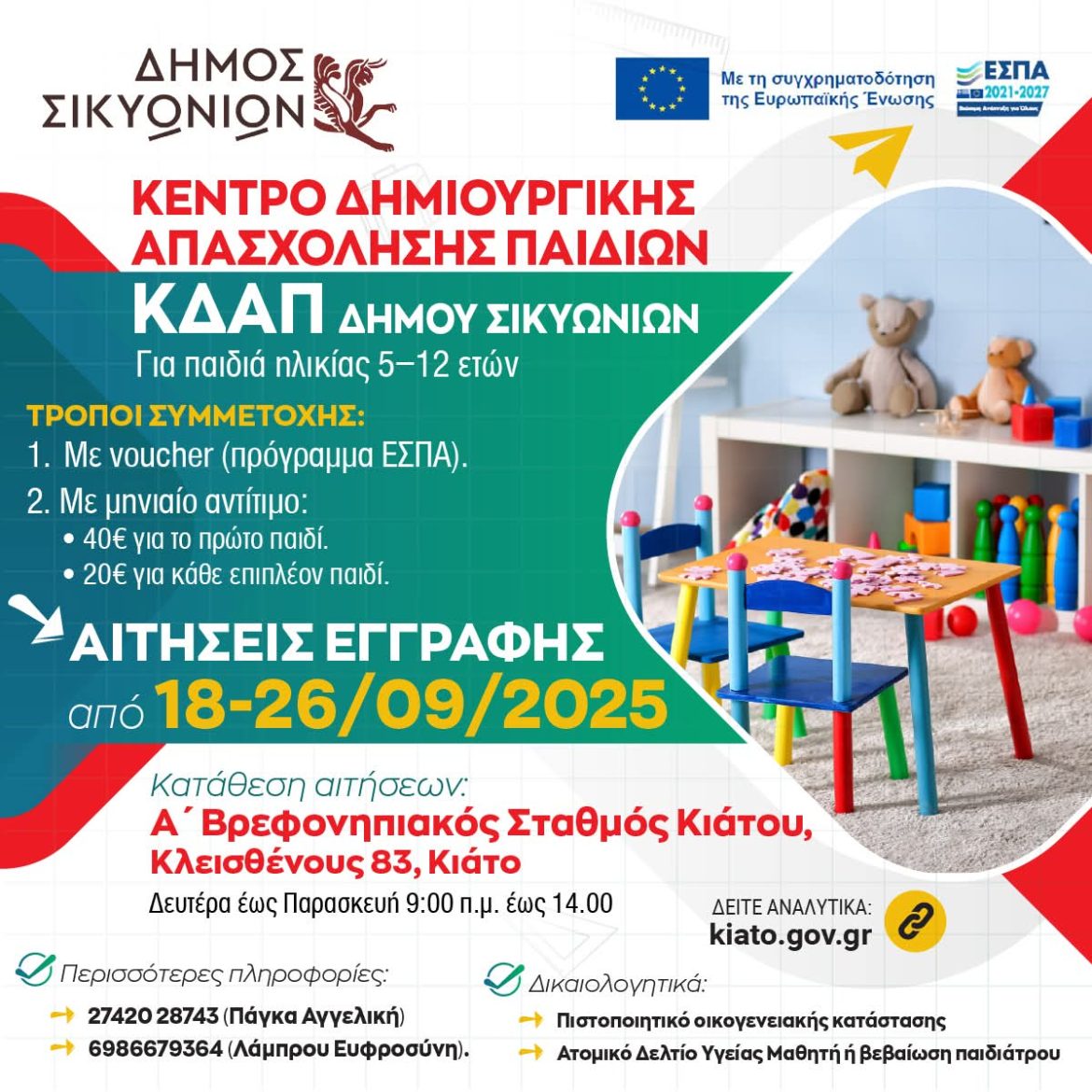 ΚΟΡΙΝΘΙΑΚΑ ΝΕΑ Yποβολή αιτήσεων εγγραφής παιδιών στο Κέντρο Δημιουργικής Απασχόλησης Παιδιών (Κ.Δ.Α.Π.) Δήμου Σικυωνίων by Κ. Α. 18 Σεπτεμβρίου, 2025 written by Κ. Α. 18 Σεπτεμβρίου, 2025 353 Yποβολή αιτήσεων εγγραφής παιδιών στο Κέντρο Δημιουργικής Απασχόλησης Παιδιών (Κ.Δ.Α.Π.) Δήμου Σικυωνίων, για την περίοδο 2025-26! Διαβάστε αναλυτικά:https://shorturl.at/EGTkK@ακόλουθοι ΔήμοςΣικυωνίων #ΚΔΑΠ #εγγραφές 0 FacebookTwitterPinterestEmail Κ. Α. previous post ΑΓΙΑΣΜΟΣ ΣΤΟ ΔΙΚΑΣΤΙΚΟ ΜΕΓΑΡΟ ΚΟΡΙΝΘΟΥ ΓΙΑ ΤΟ ΝΕΟ ΔΙΚΑΣΤΙΚΟ ΕΤΟΣ. next post ΞΕΚΙΝΗΣΑΝ ΤΑ ΜΑΘΗΜΑΤΑ ΣΤΗ ΦΙΛΑΡΜΟΝΙΚΗ ΤΟΥ ΔΗΜΟΥ ΚΟΡΙΝΘΙΩΝ.