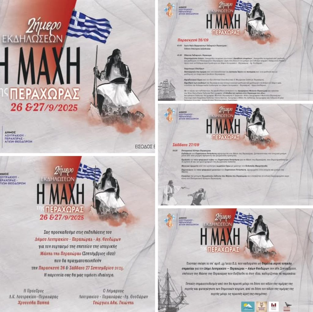 ΚΟΡΙΝΘΙΑΚΑ ΝΕΑ Η Μάχη της Περαχώρας 26 & 27 Σεπτεμβρίου 2025 by Κ. Α. 20 Σεπτεμβρίου, 2025 written by Κ. Α. 20 Σεπτεμβρίου, 2025 214 Η Μάχη της Περαχώρας 26 & 27 Σεπτεμβρίου 2025 Σας προσκαλούμε στις εκδηλώσεις του Δήμου Λουτρακίου – Περαχώρας – Αγ. Θεοδώρων για τον εορτασμό της επετείου της ιστορικής Μάχης της Περαχώρας (Σεπτέμβριος 1822) που θα πραγματοποιηθούν την Παρασκευή 26 & Σάββατο 27 Σεπτεμβρίου 2025. 🙏 Η παρουσία σας θα μας τιμήσει ιδιαίτερα. 0 FacebookTwitterPinterestEmail Κ. Α. previous post Το Υπουργείο Περιβάλλοντος και Ενέργειας ανακοινώνει παρατάσεις σε ενεργειακά προγράμματα next post 15ο ΚΑΠΗ Καλλιθέας Κορινθου.Υπογράφτηκε η σύμβαση μίσθωσης με τον ιδιοκτήτη.