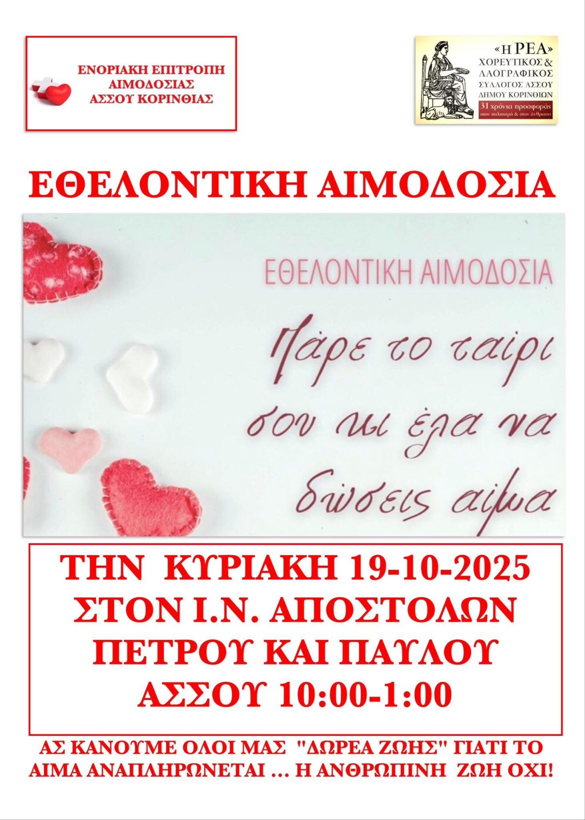 Την Κυριακή 19 Οκτωβρίου 2025 από τις 10.00 -1.00 ο Χορευτικός & Λαογραφικός Σύλλογος Άσσου «Η ΡΕΑ» και η Ενοριακή Επιτροπή Αιμοδοσίας Άσσου Κορινθίας, θα πραγματοποιήσουν εθελοντική αιμοδοσία στον Ι. Ν. Αποστόλων Πέτρου & Παύλου στον Άσσο. Είναι πολύ σημαντικό να δώσουμε όλοι το παρόν ΓΙΑΤΙ ΤΟ ΑΙΜΑ ΑΝΑΠΛΗΡΩΝΕΤΑΙ ΑΛΛΑ Η ΑΝΘΡΩΠΙΝΗ ΖΩΗ ΟΧΙ.