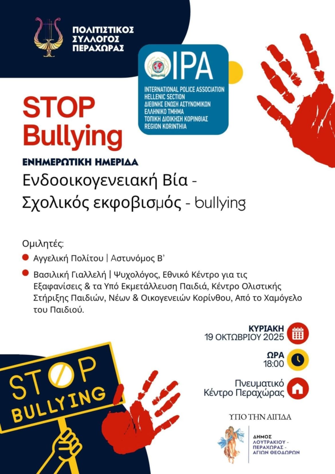 Ενημερωτική Ημερίδα για την Ενδοοικογενειακή Βία & τον Σχολικό Εκφοβισμό | Αύριο, Κυριακή 19 Οκτωβρίου στις 18:00 στο Πνευματικό Κέντρο Περαχώρας
