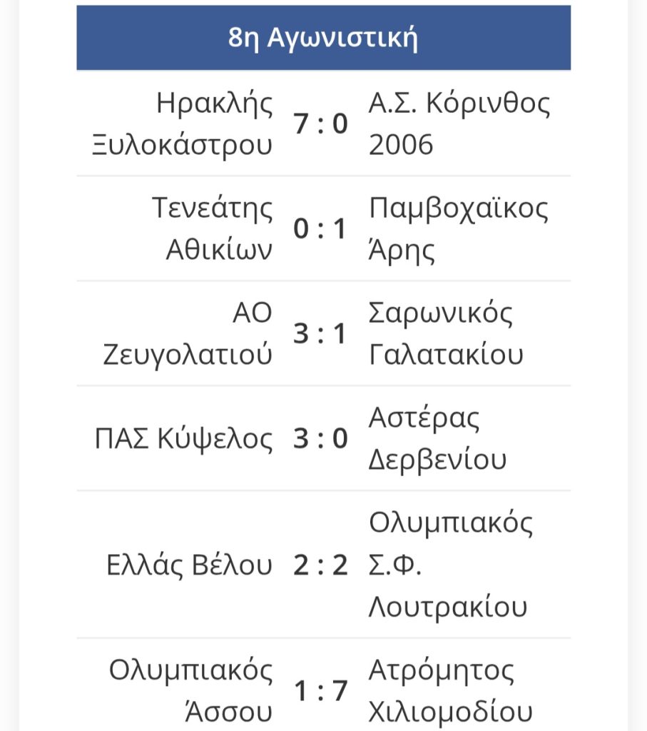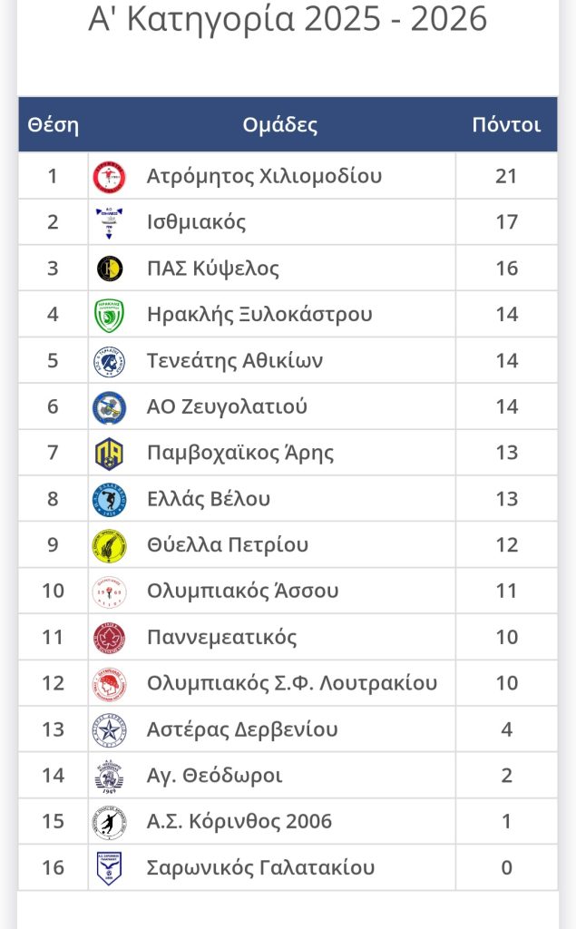ΑΘΛΗΤΙΚΑ Δειτε τα αποτελέσματα και την βαθμολογία στην Α” Κατηγορία Κορινθίας στο ποδόσφαιρο by Κ. Α. 15 Νοεμβρίου, 2025 written by Κ. Α. 15 Νοεμβρίου, 2025 325 0 FacebookTwitterPinterestEmail Κ. Α. previous post ΚΟΡΙΝΘΟΣ. Υποδοχή & Ενθρόνιση νέου Μητροπολίτη Παύλου. next post Συνελήφθη ένα άτομο για παράβαση της νομοθεσίας για τα όπλα στην Αρκαδία