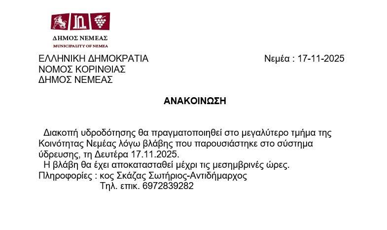 ΚΟΡΙΝΘΙΑΚΑ ΝΕΑ Διακοπή υδροδότησης στην Νεμέα Κορινθίας by Κ. Α. 17 Νοεμβρίου, 2025 written by Κ. Α. 17 Νοεμβρίου, 2025 73 0 FacebookTwitterPinterestEmail Κ. Α. previous post ΣΕΑΚ. Η Αρχαία Κόρινθος αξίζει τη συνεχή φροντίδα και τον σεβασμό μας. next post Το ΔΗΣΥΝ Σικυωνίων έδωσε το παρών στην Πανελλαδική Συνάντηση