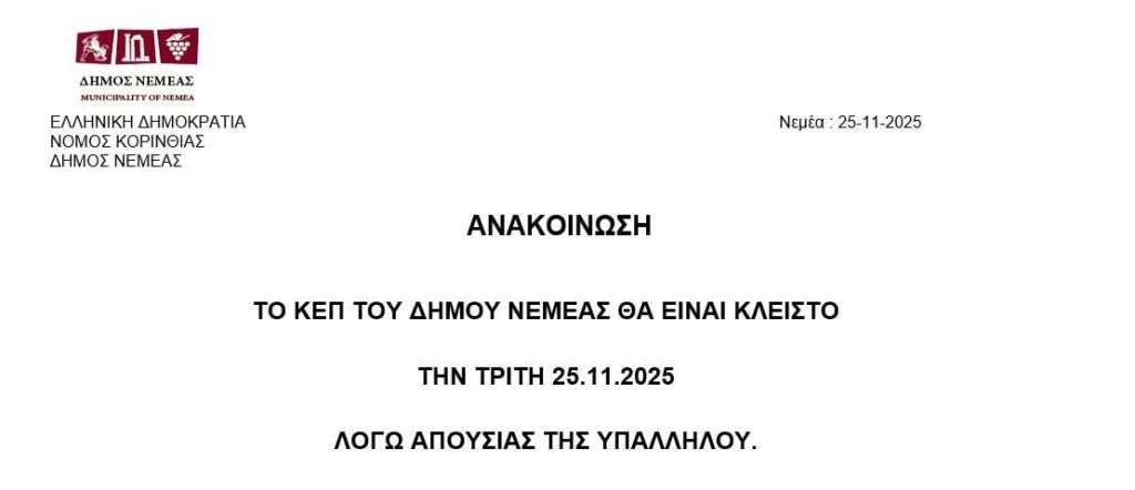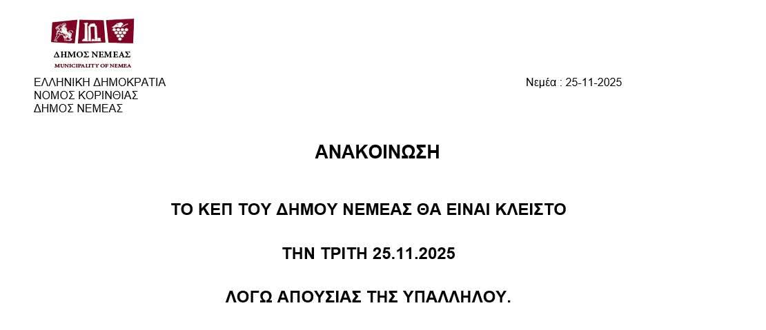 ΚΟΡΙΝΘΙΑΚΑ ΝΕΑ Κλειστό σήμερα Τρίτη το ΚΕΠ του Δήμου Νεμέας by Κ. Α. 25 Νοεμβρίου, 2025 written by Κ. Α. 25 Νοεμβρίου, 2025 147 0 FacebookTwitterPinterestEmail Κ. Α. previous post Παραιτήθηκε ο προπονητής της ανδρικής ομάδας ποδοσφαίρου ΠΑΝΕΛΕΥΣΙΝΙΑΚΟΣ Α.Ο next post ΔΗΜΟΣ ΚΟΡΙΝΘΙΩΝ. Παρατείνεται η ημερομηνία εγγραφών για τις δωρεάν κοινωνικές θέσεις σε φροντιστήρια ξένων γλωσσών
