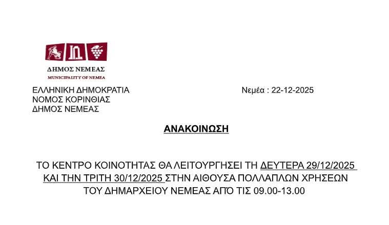 ΚΟΡΙΝΘΙΑΚΑ ΝΕΑ Ανακοίνωση του Δήμου Νεμέας by Κ. Α. 22 Δεκεμβρίου, 2025 written by Κ. Α. 22 Δεκεμβρίου, 2025 378 0 FacebookTwitterPinterestEmail Κ. Α. previous post Ευχές από την Ο. Ε.Β.Ε ΚΟΡΙΝΘΙΑΣ next post ΧΡΙΣΤΟΥΓΕΝΝΙΑΤΙΚΗ ΕΚΔΗΛΩΣΗ 2025 στον Μαψο Κορινθίας