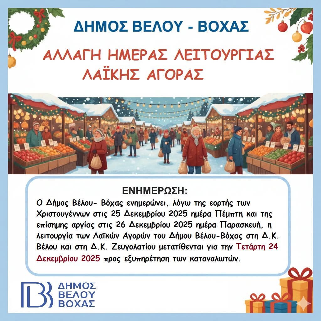 ΚΟΡΙΝΘΙΑΚΑ ΝΕΑ Δήμος Βέλου-Βόχας. 𝝖𝝼𝝰𝝹𝝾ί𝝼𝞈𝞂𝝶 – 𝝖𝝺𝝺𝝰𝝲ή 𝝶𝝻έ𝞀𝝰ς 𝝺𝝴𝝸𝞃𝝾𝞄𝞀𝝲ί𝝰ς 𝝠𝝰ϊ𝝹ής 𝝖𝝲𝝾𝞀άς by Κ. Α. 23 Δεκεμβρίου, 2025 written by Κ. Α. 23 Δεκεμβρίου, 2025 325 𝝖𝝼𝝰𝝹𝝾ί𝝼𝞈𝞂𝝶 – 𝝖𝝺𝝺𝝰𝝲ή 𝝶𝝻έ𝞀𝝰ς 𝝺𝝴𝝸𝞃𝝾𝞄𝞀𝝲ί𝝰ς 𝝠𝝰ϊ𝝹ής 𝝖𝝲𝝾𝞀άς Ο 𝝙ή𝝻𝝾ς 𝝗έ𝝺𝝾𝞄-𝝗ό𝞆𝝰ς ενημερώνει τους δημότες ότι, λόγω της εορτής των 𝝬𝞀𝝸𝞂𝞃𝝾𝞄𝝲έ𝝼𝝼𝞈𝝼 (𝟮𝟱/𝟭𝟮)και της 𝝴𝝿ί𝞂𝝶𝝻𝝶ς 𝝰𝞀𝝲ί𝝰ς 𝞃𝝶ς 𝟮𝟲𝝶ς 𝝙𝝴𝝹𝝴𝝻𝝱𝞀ί𝝾𝞄, η λειτουργία των 𝝠𝝰ϊ𝝹ώ𝝼 𝝖𝝲𝝾𝞀ώ𝝼 του Δήμου μεταφέρεται. 🗓 𝝤𝝸 𝝠𝝰ϊ𝝹ές 𝝖𝝲𝝾𝞀ές 𝞂𝞃𝝶 𝝙.𝝟. 𝝗έ𝝺𝝾𝞄 𝝹𝝰𝝸 𝞂𝞃𝝶 𝝙.𝝟. 𝝛𝝴𝞄𝝲𝝾𝝺𝝰𝞃𝝸𝝾ύ 𝝷𝝰 𝝺𝝴𝝸𝞃𝝾𝞄𝞀𝝲ή𝞂𝝾𝞄𝝼 𝞃𝝶𝝼 𝝩𝝴𝞃ά𝞀𝞃𝝶 𝟮𝟰 𝝙𝝴𝝹𝝴𝝻𝝱𝞀ί𝝾𝞄 𝟮𝟬𝟮𝟱, προς καλύτερη εξυπηρέτηση των καταναλωτών. Παρακαλούνται οι πολίτες και οι επαγγελματίες να λάβουν γνώση της αλλαγής. 🎄 Ο Δήμος Βέλου-Βόχας εύχεται σε όλους 𝝟𝝰𝝺ά 𝝬𝞀𝝸𝞂𝞃𝝾ύ𝝲𝝴𝝼𝝼𝝰 𝝻𝝴 𝞄𝝲𝝴ί𝝰 𝝹𝝰𝝸 𝞆𝝰𝞀ά. 0 FacebookTwitterPinterestEmail Κ. Α. previous post Η ΠΑΝΗΓΥΡΗ ΤΟΥ ΕΝΟΡΙΑΚΟΥ Ι. ΝΑΟΥ ΑΓΙΑΣ ΑΝΑΣΤΑΣΙΑΣ ΦΑΡΜΑΚΟΛΥΤΡΙΑΣ (ΠΟΣΕΙΔΩΝΙΑΣ) ΚΟΡΙΝΘΟΥ. next post ΜΗΝΥΜΑ ΤΟΥ ΣΕΒ. ΜΗΤΡΟΠΟΛΙΤΟΥ ΜΑΣ κ. ΠΑΥΛΟΥ ΓΙΑ ΤΗΝ ΕΟΡΤΗ ΤΩΝ ΧΡΙΣΤΟΥΓΕΝΝΩΝ 2025