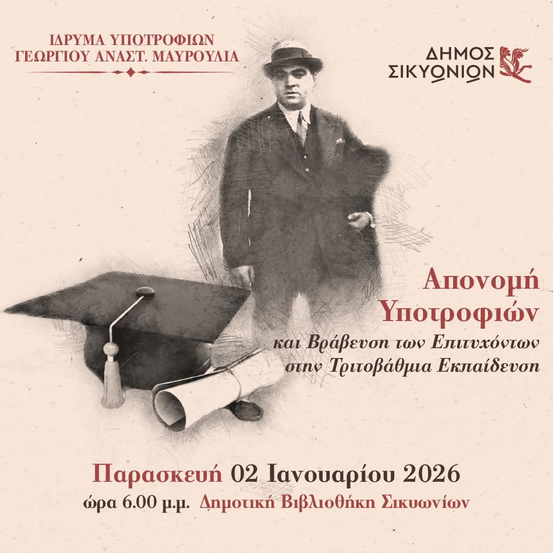 Η γνώση, η προσπάθεια και η αριστεία έχουν πάντα θέση στον τόπο μας. 📍 Δημοτική Βιβλιοθήκη Σικυωνίων 🗓 Παρασκευή 2 Ιανουαρίου 2026 | ⏰ 18:00 ✅ Τιμούμε τη μνήμη του ευεργέτη Γεωργίου Αναστ. Μαυρούλια και στηρίζουμε έμπρακτα τη νέα γενιά. ✅ Απονομή υποτροφιών επιτυχόντων στην τριτοβάθμια εκπαίδευση για το έτος 2024 και συνέχισης χορηγίας λόγω άριστων επιδόσεων. @ακόλουθοι @κορυφαίοι θαυμαστές Τμήμα Πολιτισμού-Αθλητισμού-Παιδείας δήμου Σικυωνίων Σπύρος Σταματόπουλος