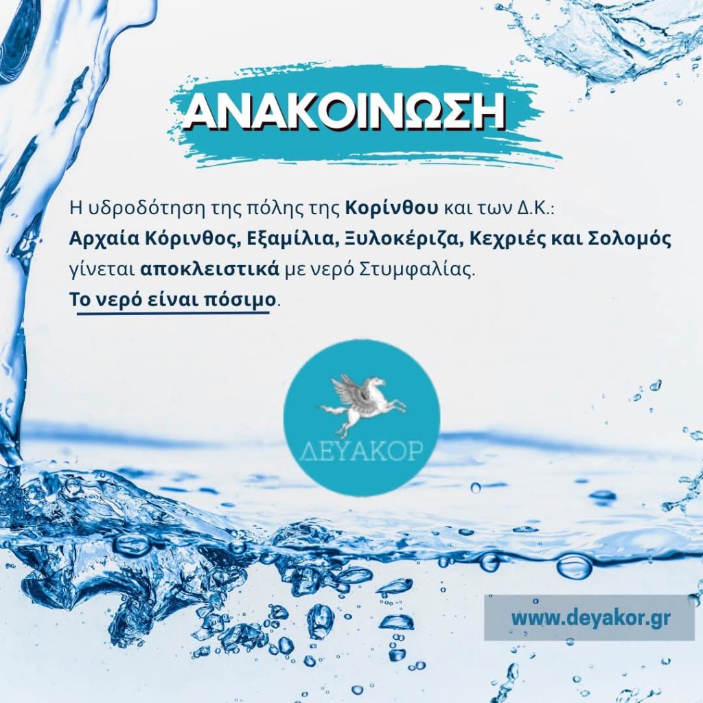 ✅ Το νερό είναι πόσιμο 🔬 Πραγματοποιούνται μηνιαίες αναλύσεις ποιότητας 🌐 Τα αποτελέσματα είναι αναρτημένα στην ιστοσελίδα της ΔΕΥΑ Κορίνθου