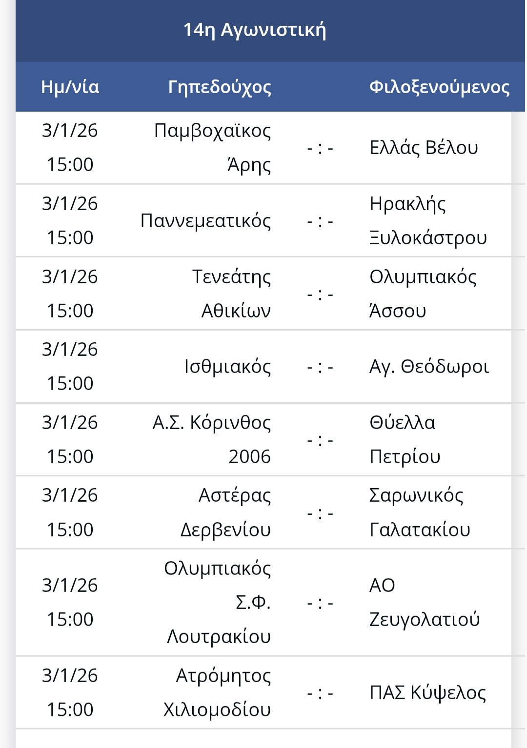 ΑΘΛΗΤΙΚΑ Δειτε τους σημερινούς αγώνες της Α’ Κατηγορίας Κορινθίας στο ποδόσφαιρο by Κ. Α. 3 Ιανουαρίου, 2026 written by Κ. Α. 3 Ιανουαρίου, 2026 436 0 FacebookTwitterPinterestEmail Κ. Α. previous post Στοχευμένη αστυνομική επιχείρηση πραγματοποιήθηκε στη Μεσσηνία next post Δείτε τα αποτελέσματα και την βαθμολογία στην Α’ κατηγορία Κορινθίας στο ποδόσφαιρο