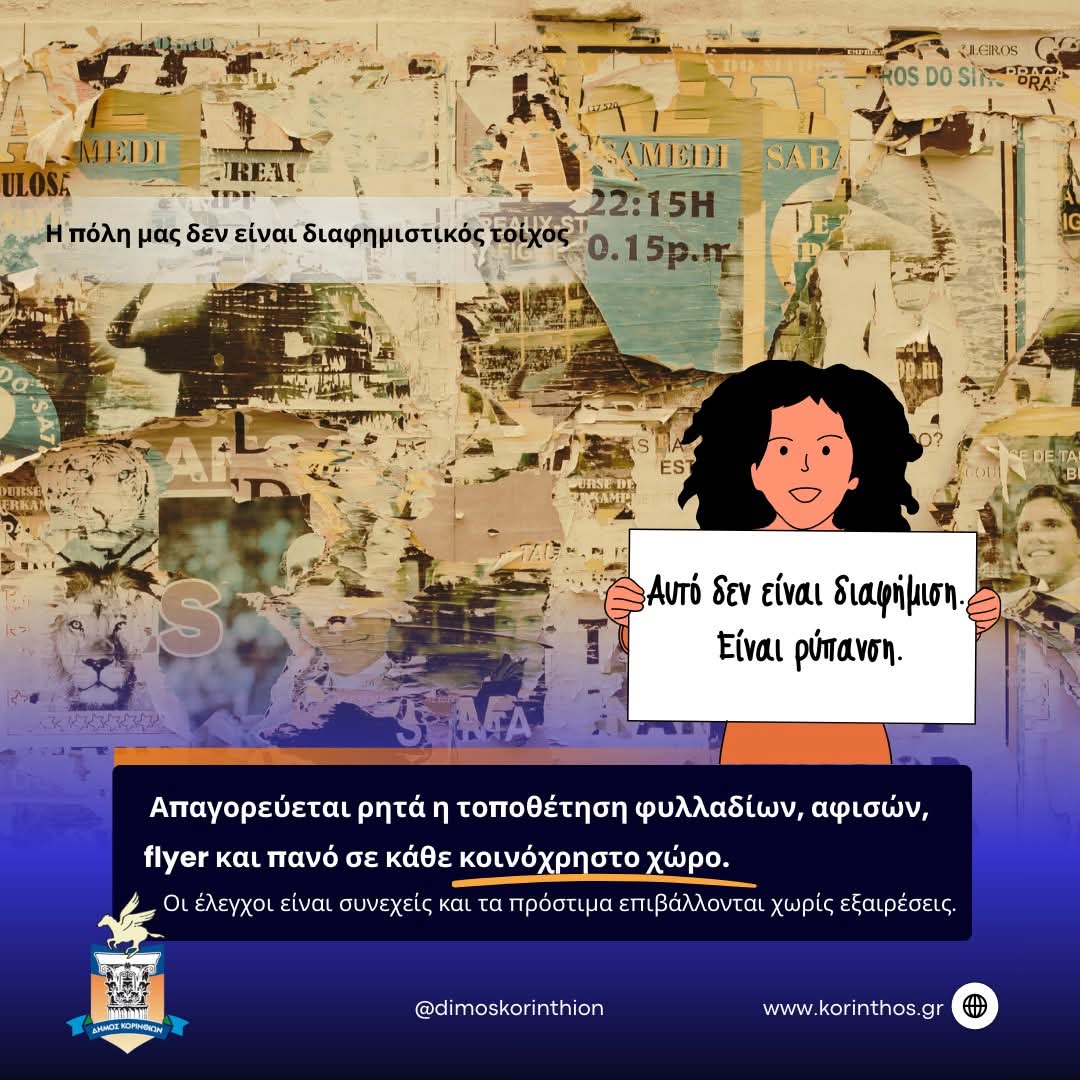 Η Υπηρεσία Καθαριότητας του Δήμου Κορινθίων υπενθυμίζει προς όλους τους δημότες -και ιδίως προς τις επιχειρήσεις και τους επαγγελματίες- ότι η ανεξέλεγκτη διανομή και ανάρτηση διαφημιστικού υλικού αποτελεί σοβαρή παράβαση του Κανονισμού Καθαριότητας του Δήμου Κορινθίων, καθώς και της ισχύουσας νομοθεσίας.