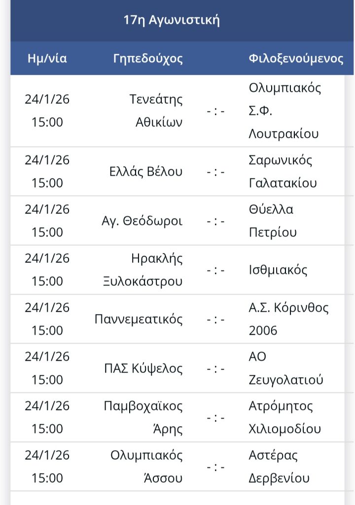 ΑΘΛΗΤΙΚΑ Δειτε τους σημερινούς αγώνες της Α’ Κατηγορίας Κορινθίας στο ποδόσφαιρο by Κ. Α. 24 Ιανουαρίου, 2026 written by Κ. Α. 24 Ιανουαρίου, 2026 150 0 FacebookTwitterPinterestEmail Κ. Α. previous post Κρίση Αντιστρατήγων της Ελληνικής Αστυνομίας next post Δεύτερο Ανατρεπτικό Καρναβάλι της Κοινότητας Γαλατάκιου!!!