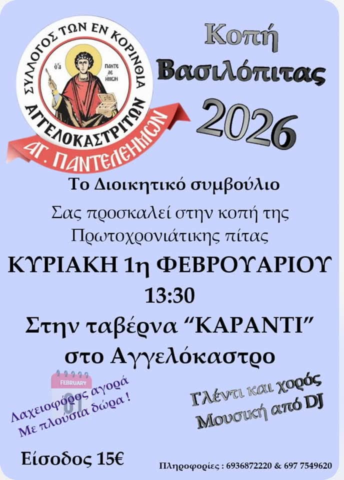 ΚΟΡΙΝΘΙΑΚΑ ΝΕΑ Κοπή Πρωτοχρονιάτικης Πίτας απο τον Σύλλογο Αγγελοκαστριτων “Ο Άγιος Παντελεήμων” by Κ. Α. 31 Ιανουαρίου, 2026 written by Κ. Α. 31 Ιανουαρίου, 2026 343 0 FacebookTwitterPinterestEmail Κ. Α. previous post Δειτε τα αποτελέσματα και την βαθμολογία στην Α’ κατηγορία Κορινθίας στο ποδόσφαιρο next post Τασος Γκιολης. Σε κατάσταση Red code η Γενική Γραμματεία Πολιτικής Προστασίας με βάση τις προβλέψεις για τον καιρό