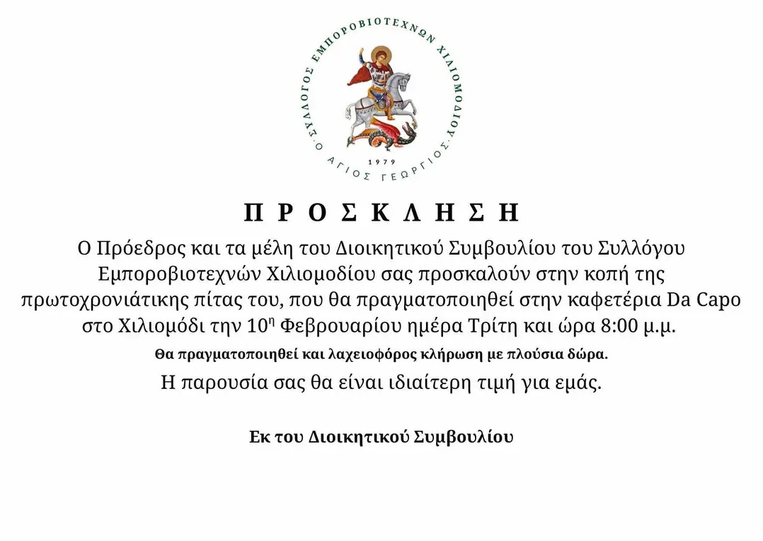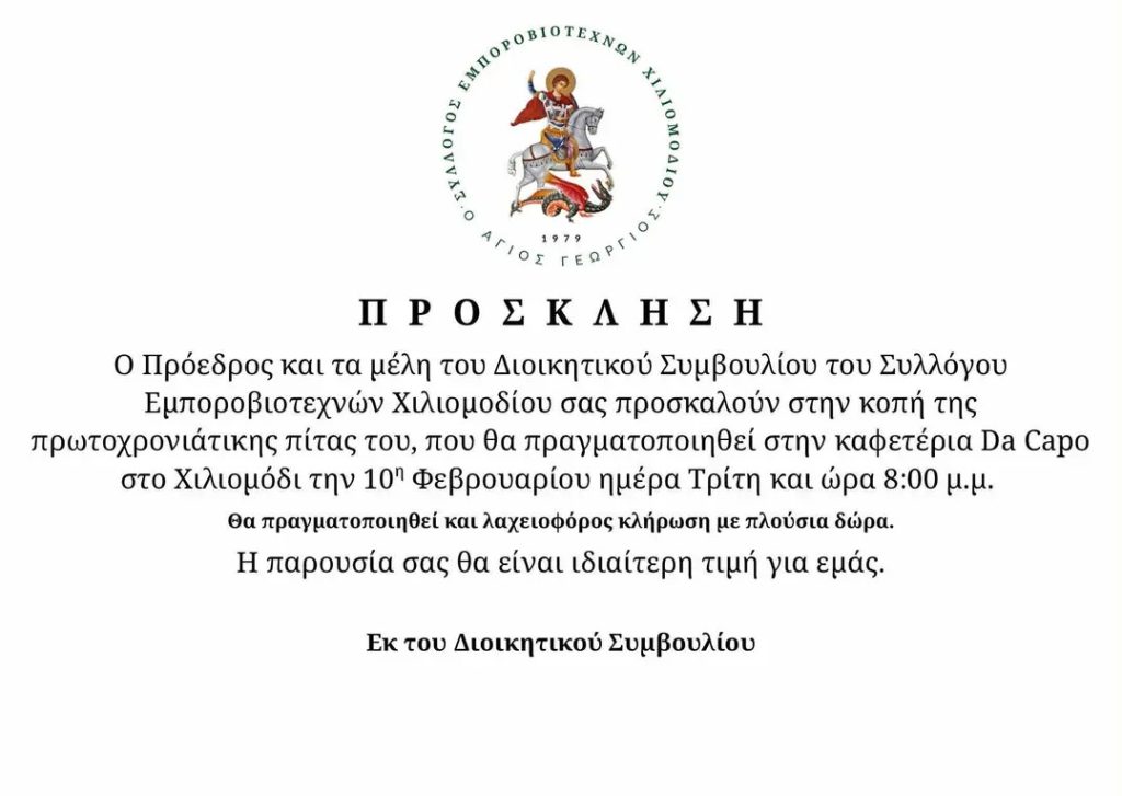 ΚΟΡΙΝΘΙΑΚΑ ΝΕΑ Κοπη Πρωτοχρονιάτικης Πίτας απο τον Εμπορικο-Βιοτεχνικο-Επαγγελματικο Σύλλογο Χιλιομοδίου σήμερα 10 Φεβρουαρίου by Κ. Α. 10 Φεβρουαρίου, 2026 written by Κ. Α. 10 Φεβρουαρίου, 2026 193 0 FacebookTwitterPinterestEmail Κ. Α. previous post ΜΑΡΙΑ ΠΡΩΤΟΠΑΠΠΑ.Δήμος σε κρίση: Έλλειμμα, φτωχό τεχνικό πρόγραμμα και πολιτική αλαζονεία next post Ο Σύλλογος Γυναικών Αγίων Θεοδώρων έκοψε την πρωτοχρονιατικη πιτα