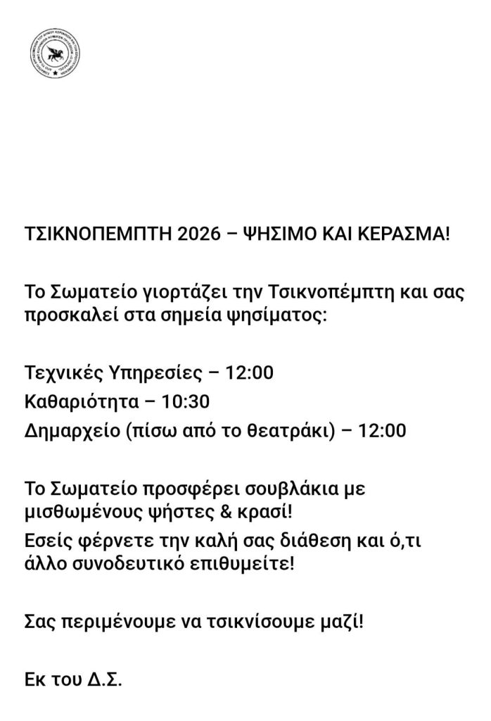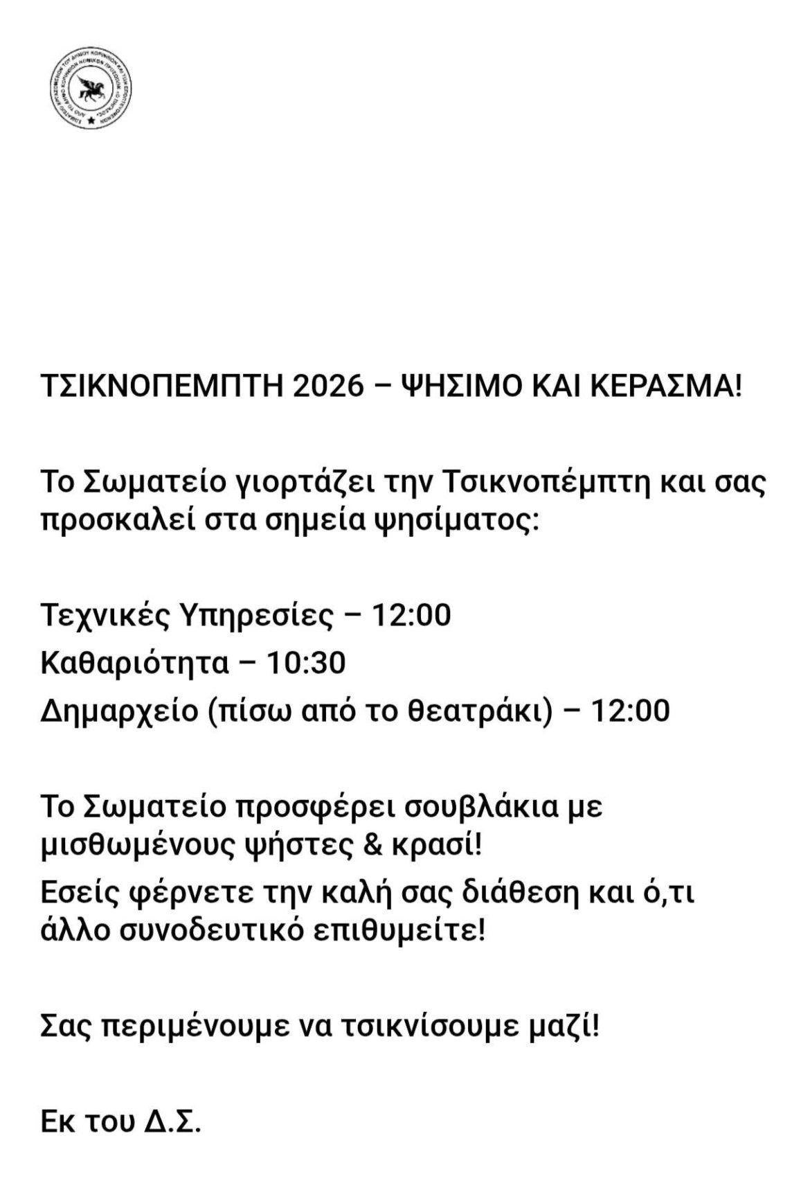 ΚΟΡΙΝΘΙΑΚΑ ΝΕΑ Το Σωματείο Εργαζομένων Δήμου Κορινθίων σας προσκαλεί στο ψήσιμο της Τσικνοπέμπτης by Κ. Α. 11 Φεβρουαρίου, 2026 written by Κ. Α. 11 Φεβρουαρίου, 2026 251 0 FacebookTwitterPinterestEmail Κ. Α. previous post Εμπορικός Σύλλογος Κορίνθου. Τσικνοπέμπτη στην Κόρινθο!! next post Έκτακτο Δελτίο Επιδείνωσης Καιρού