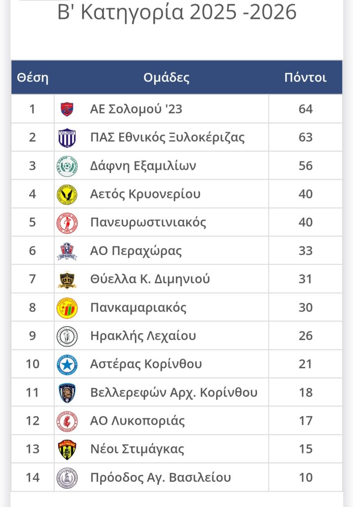 ΑΘΛΗΤΙΚΑ Δειτε τα αποτελέσματα και την βαθμολογία στην Β’ κατηγορία Κορινθίας στο ποδόσφαιρο by Κ. Α. 22 Μαρτίου, 2026 written by Κ. Α. 22 Μαρτίου, 2026 218 0 FacebookTwitterPinterestEmail Κ. Α. previous post Δήμος Σικυωνίων: Το νερό των πηγών μας, άλλαξε τη μοίρα του τόπου μας! next post Πανελλαδική απεργία των Ταξί και συγκέντρωση στην Αθήνα από ολόκληρη την Ελλάδα.