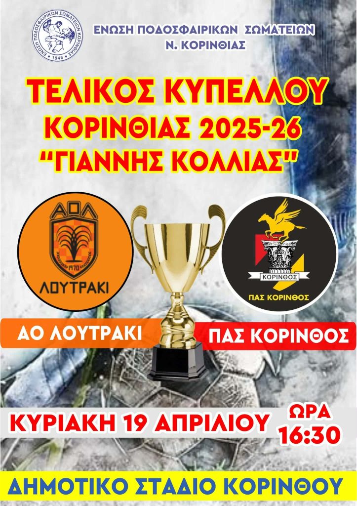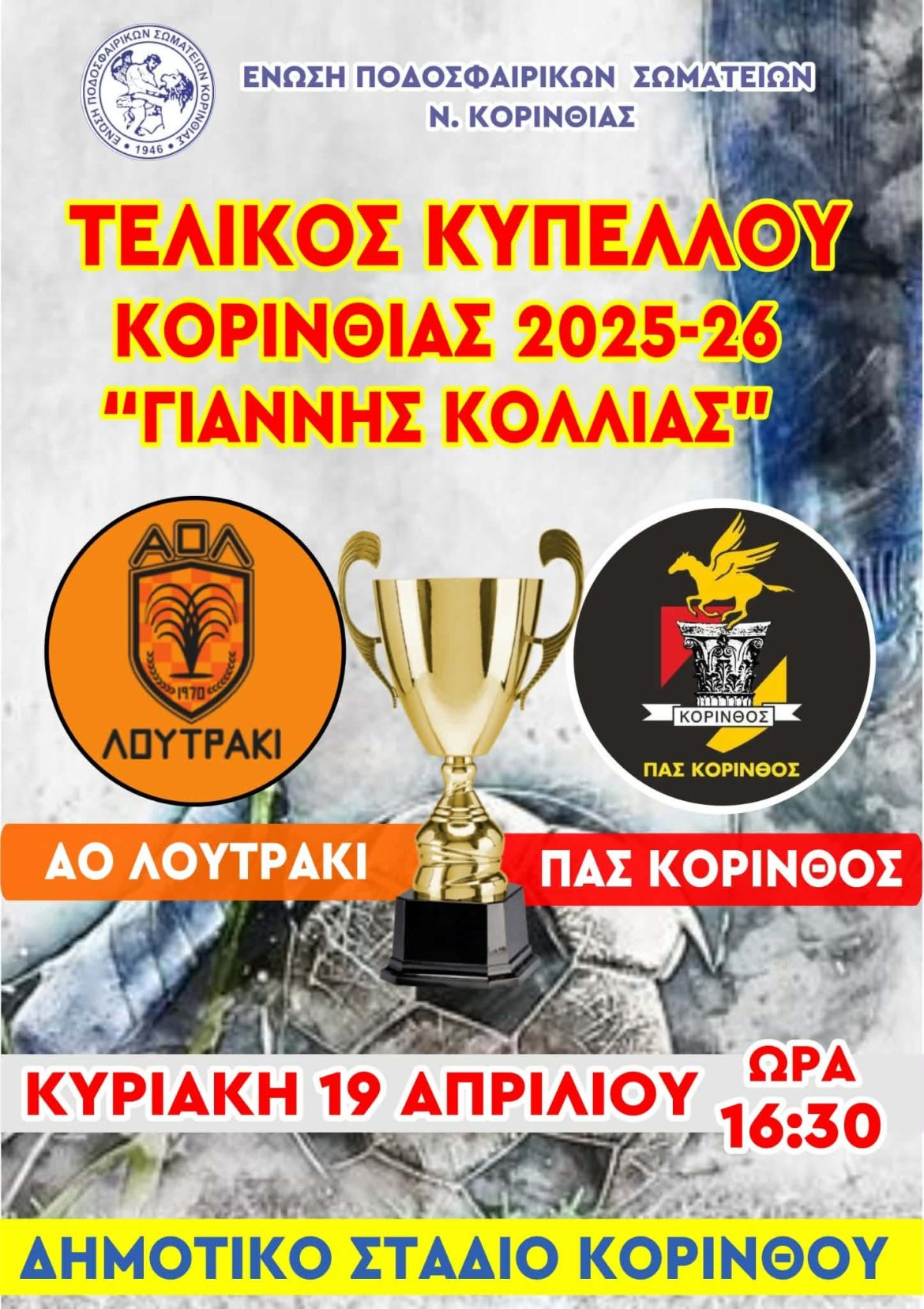 ΑΘΛΗΤΙΚΑ ΤΕΛΙΚΟΣ ΚΥΠΕΛΛΟΥ ΕΠΣ Κορινθίας την Κυριακή 19 Απριλίου 2026 by Κ. Α. 9 Απριλίου, 2026 written by Κ. Α. 9 Απριλίου, 2026 161 ΤΕΛΙΚΟΣ ΚΥΠΕΛΛΟΥ ΕΠΣ Κορινθίας.Είσοδος ελεύθερη σε γυναίκες και παιδιά. 0 FacebookTwitterPinterestEmail Κ. Α. previous post Συνελήφθησαν -2- άτομα για ναρκωτικά στη Μεσσηνία next post Στοχευμένες αστυνομικές επιχειρήσεις πραγματοποιήθηκαν στην Αργολίδα, στην Κορινθία και στη Λακωνία