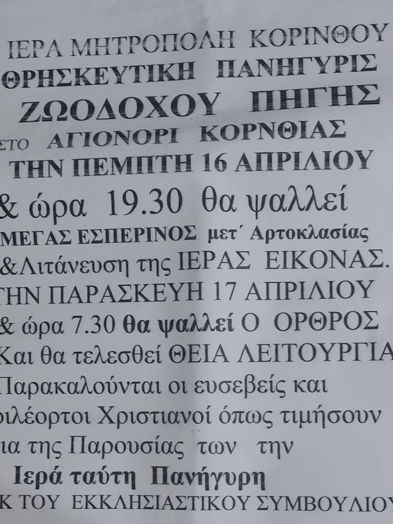 ΚΟΡΙΝΘΙΑΚΑ ΝΕΑ ΓΙΟΡΤΆΖΕΙ Ο ΝΑΟΣ ΤΗΣ ΖΩΟΔΟΧΟΥ ΠΗΓΗΣ ΣΤΟ ΑΓΙΟΝΟΡΙ ΚΟΡΙΝΘΙΑΣ by Κ. Α. 15 Απριλίου, 2026 written by Κ. Α. 15 Απριλίου, 2026 146 ΠΕΜΠΤΗ 16 ΑΠΡΙΛΙΟΥ ΤΗΣ ΖΩΟΔΟΧΟΥ ΠΗΓΗΣ ΣΤΟ ΑΓΙΟΝΟΡΙ ΚΟΡΙΝΘΙΑΣ & ωρα 7:30 μμ θα ψαλλει ΜΕΓΑΣ ΕΣΠΕΡΙΝΟΣ μετ’ Αρτοκλασίας & Λιτάνευση της ΙΕΡΑΣ ΕΙΚΟΝΑΣ. ΤΗΝ ΠΑΡΑΣΚΕΥΗ 17 ΑΠΡΙΛΙΟΥ & ώρα 7:30 πμ θα ψαλλει ο ΌΡΘΡΟΣ και θα τελεσθεί η ΘΕΙΑ ΛΕΙΤΟΥΡΓΙΑ. 0 FacebookTwitterPinterestEmail Κ. Α. previous post Στοχευμένες αστυνομικές επιχειρήσεις πραγματοποιήθηκαν στην Αρκαδία, στην Κορινθία και στη Μεσσηνία next post Πριν λίγο. Τρόμος από προσπαθεια εισβολής αγνώστων σε οικία στην Καλλιθέα Κορίνθου