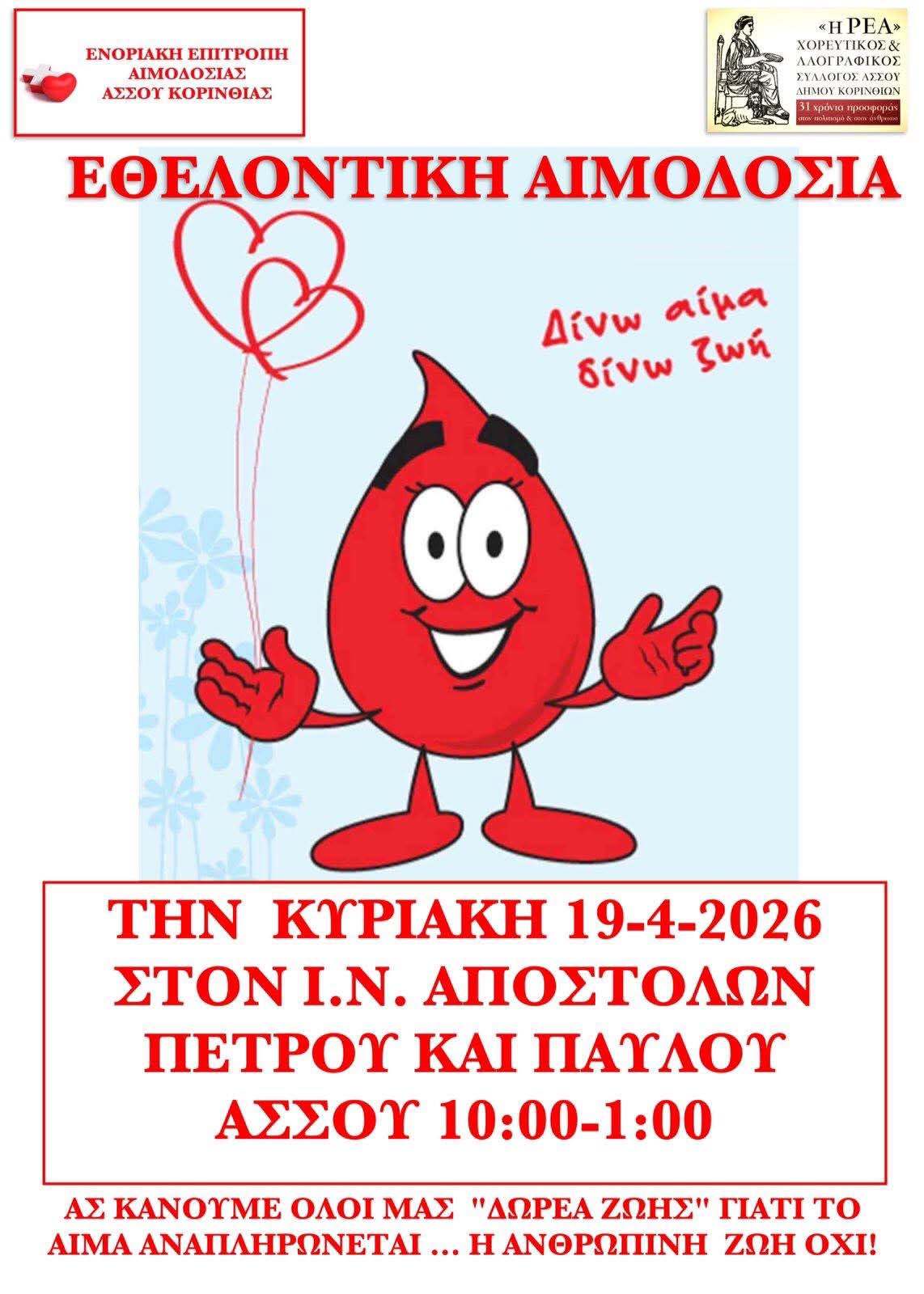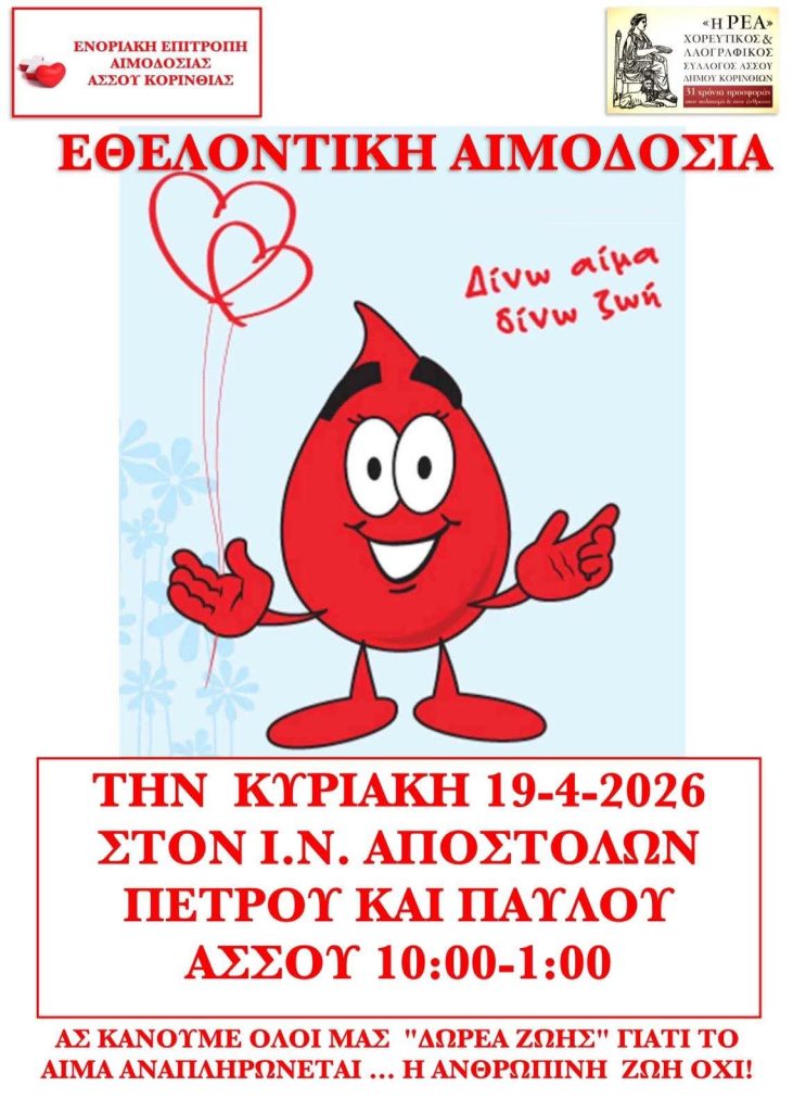 ΚΟΡΙΝΘΙΑΚΑ ΝΕΑ Εθελοντική αιμοδοσία στον Ιερο Ναο Αποστόλων Πέτρου & Παύλου στον Άσσο 10-13πμ την Κυριακή 19 Απριλίου 2026 by Κ. Α. 18 Απριλίου, 2026 written by Κ. Α. 18 Απριλίου, 2026 66 0 FacebookTwitterPinterestEmail Κ. Α. previous post Εντοπίστηκε πτώμα νεαρής κοπέλας στον Ισθμό της Κορίνθου. next post Εκπαίδευση πρώτων βοηθειών στα Λουτρά Ωραίας Ελένης την Κυριακή 26 Απριλίου. Διοργανώνει ο Πολιτιστικός Σύλλογος “ΣΟΛΥΓΕΙΟΣ ΔΕΣΜΟΣ “