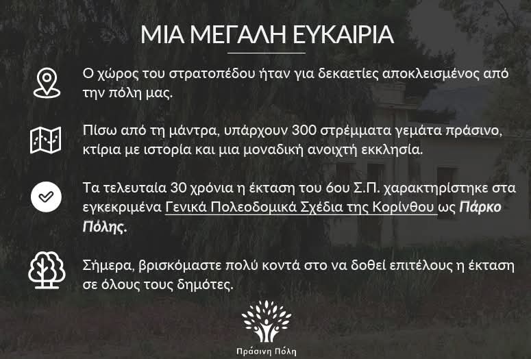 Η Πράσινη Πόλη συνεχίζει την υπεύθυνη ενημέρωση των δημοτών σχετικά με το θέμα του στρατοπέδου Καλογερογιάννη, ένα ζήτημα που αφορά άμεσα το μέλλον της Κορίνθου και την αναπτυξιακή της προοπτική.
