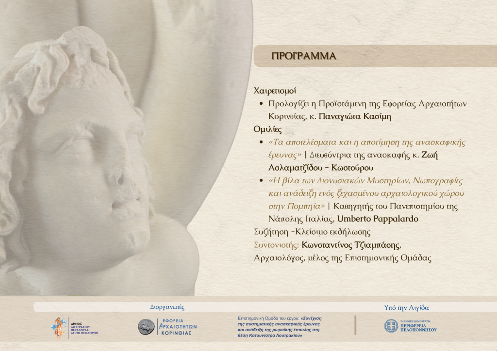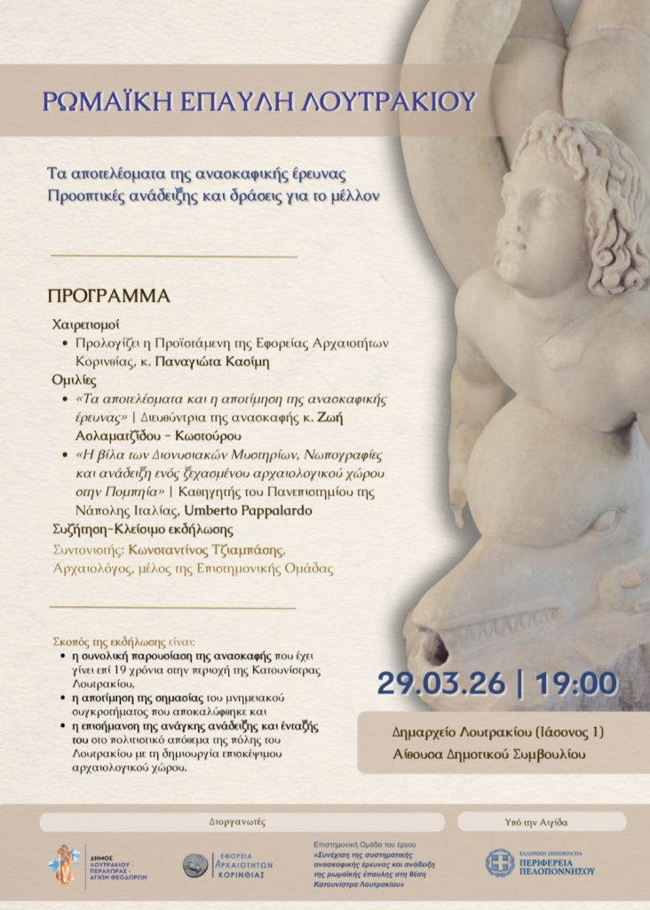 Ο Δήμος Λουτρακίου-Περαχώρας-Αγίων Θεοδώρων, η Εφορεία Αρχαιοτήτων Κορινθίας και η Επιστημονική Ομάδα του έργου «Συνέχιση της συστηματικής ανασκαφικής έρευνας και ανάδειξη της ρωμαϊκής έπαυλης στη θέση Κατουνίστρα Λουτρακίου», σας προσκαλούν σε εκδήλωση με θέμα: