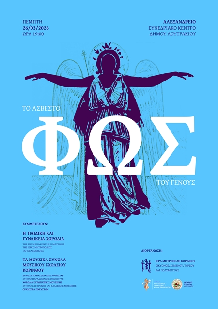 Η Ιερά Μητρόπολη Κορίνθου γνωστοποιεί ότι την Πέμπτη 26 Μαρτίου 2026 και ώρα 7:00 μ.μ., στο Αλεξάνδρειο Συνεδριακό Κέντρο του Δήμου Λουτρακίου θα πραγματοποιηθεί εορταστική επετειακή εκδήλωση για την Εθνική Παλιγγενεσία σε συνεργασία με το Μουσικό Σχολείο Κορίνθου.
