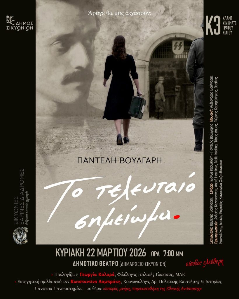 ➡ Την Κυριακή 22 Μαρτίου στις 19:00, ο Δήμος Σικυωνίων και η Κ3 -Κλαμπ Κινηματογράφου Κιάτου σάς προσκαλούν στην προβολή της ταινίας «𝝩𝝤 𝝩𝝚𝝠𝝚𝝪𝝩𝝖𝝞𝝤 𝝨𝝜𝝡𝝚𝝞𝝮𝝡𝝖».