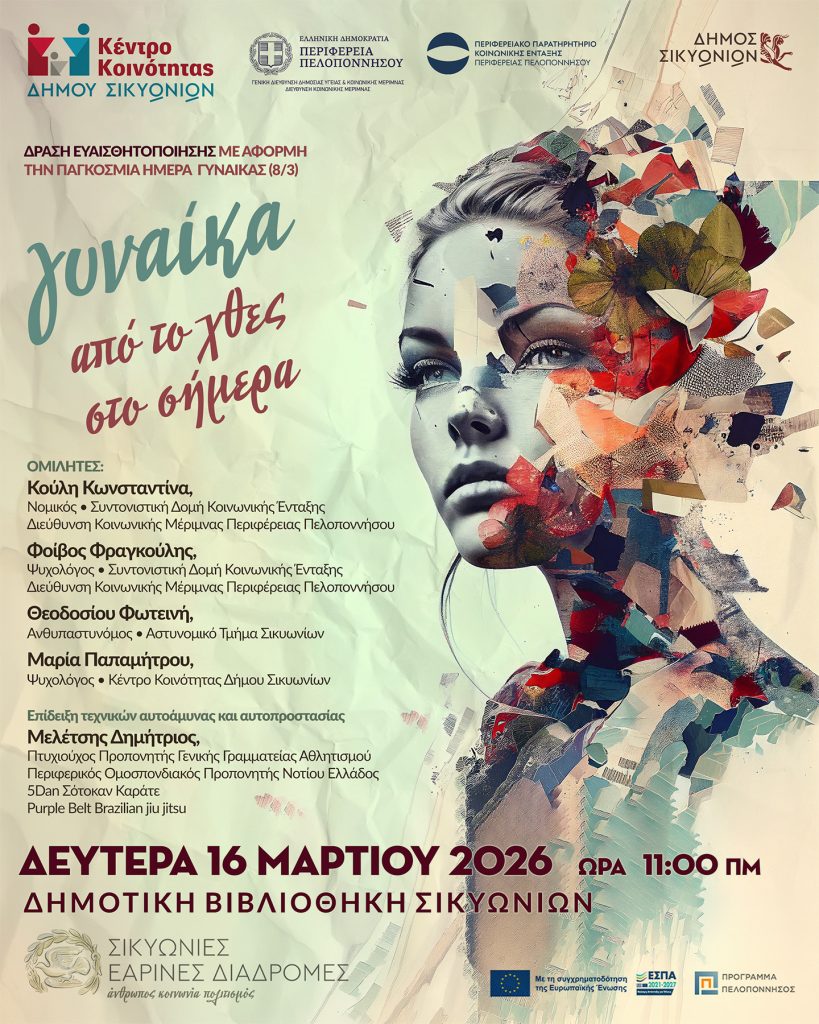 Ο Δήμος Σικυωνίων, συνεχίζοντας τον κύκλο δράσεων «Σικυώνιες Εαρινές Διαδρομές», διοργανώνει αύριο, Δευτέρα 16 Μαρτίου 2026 και ώρα 11:00 π.μ., μια ξεχωριστή εκδήλωση αφιερωμένη στη γυναίκα. Η δράση με τίτλο «Γυναίκα: Από το Χθες στο Σήμερα» θα πραγματοποιηθεί στη Δημοτική Βιβλιοθήκη Σικυωνίων, αποτελώντας μια συνδιοργάνωση του Κέντρου Κοινότητας του Δήμου και της Συντονιστικής Δομής Κοινωνικής Ένταξης της Περιφέρειας Πελοποννήσου.