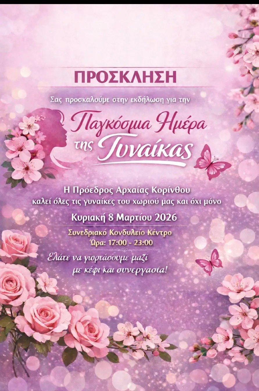 Με αφορμή την Ημέρα της Γυναίκας, η Ένωση Αποστράτων Αξιωματικών Στρατού / Παράρτημα Κορίνθου , ο Δήμος Κορινθίων και το Επιμελητήριο σας προσκαλούν σε μια σημαντική ενημερωτική διάλεξη για τον καρκίνο του μαστού, με θέμα: