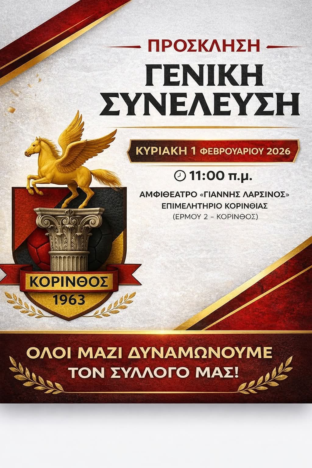 Καλούνται τα μέλη του Σωματείου «Π.Α.Σ. ΚΟΡΙΝΘΟΣ» σε Γενική Συνέλευση, η οποία θα πραγματοποιηθεί την Κυριακή 1 Φεβρουαρίου 2026, στο Αμφιθέατρο «Γιάννης Λαρσινός» του Επιμελητηρίου Κορινθίας (Ερμού 2 – Κόρινθος), με ώρα έναρξης 11:00 π.μ.