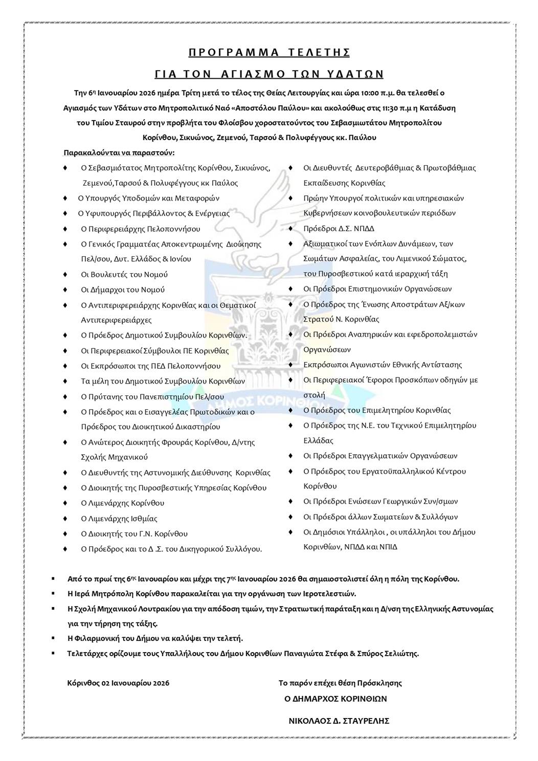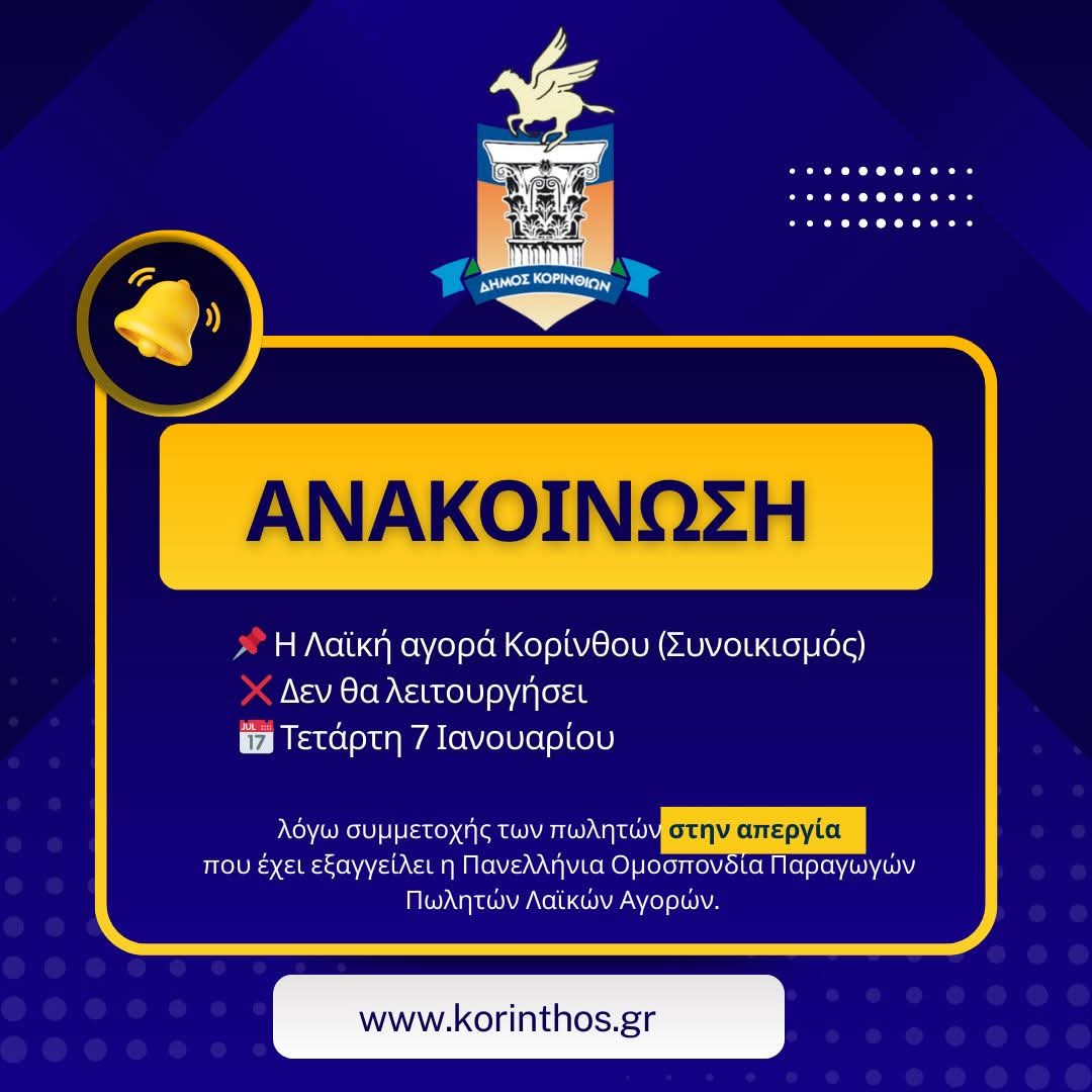 Από την Διεύθυνση Τοπικής Ανάπτυξης / Τμήμα Εμπορίου και Υπηρεσιών του Δήμου Κορινθίων ανακοινώνεται ότι η λαϊκή αγορά της Κορίνθου (Συνοικισμός) δεν θα λειτουργήσει την Τετάρτη 7 Ιανουαρίου, λόγω συμμετοχής των πωλητών στην απεργία που έχει εξαγγείλει η Πανελλήνια Ομοσπονδία Παραγωγών Πωλητών