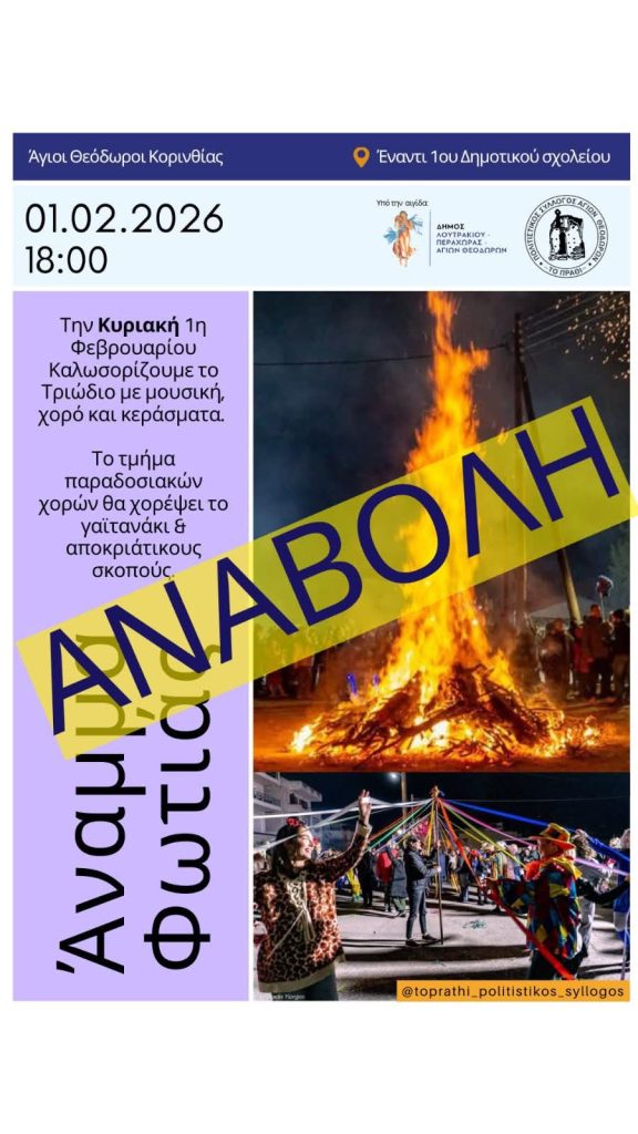 Λόγω των καιρικών προβλέψεων και προειδοποιήσεων για ακραία καιρικά φαινόμενα, το Άναμμα της Φωτιάς από τον Πολιτιστικός Σύλλογος ‘Το Πράθι’, μεταφέρεται για την Τρίτη, 3 Φεβρουαρίου και ώρα 18:00.